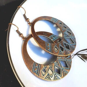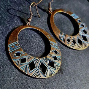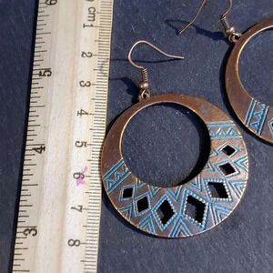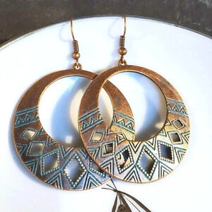 Antique Copper Verdigris Blue Green Patina Round Geometric Cutout Earrings