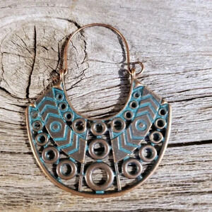 Antique Copper Verdigris Filigree Circles Chevrons Demi Circle Patina Earrings