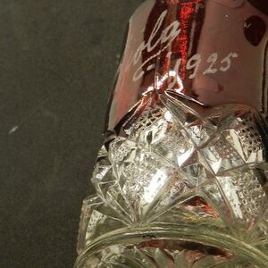 This antique glass pitcher, signed Viola 1925, is a beautiful addition to any home decor. The creamer/pitcher is made of high-quality glass in a glossy finish and features an intricate art deco design. The pitcher is a licensed reproduction of the original piece, adding to its value and uniqueness. The vibrant red color and fused glass production technique make this piece stand out as a decorative item. The pitcher is perfect for serving drinks or as a decorative piece on its own. Its exact origin and backstamp are unknown, adding to its mystery and allure. This rare find from the 1925 time period is a must-have for any collector or lover of vintage decor.