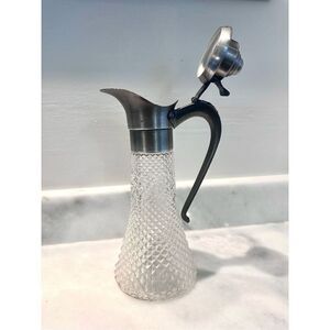 Antique Crystal Crosshatch Diamond Point Glass Pewter Lid & Handle Pitcher Decan