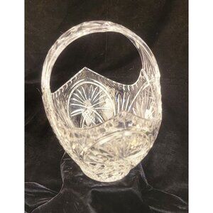 Antique Cut Crystal Basket. 24% lead, hand-cut crystal. Crafted by Shannon Crystal Designs of Ireland in the 1980s, this beautiful basket is made of high-quality 24% lead crystal that reflects the light exquisitely. It can be used to hold things such as fruit, candy, trinkets, or simply as an elegant addition to your decor. Approximate measurements: 8 in x 9.25 in x 6 in. Please see the provided photos for further details.