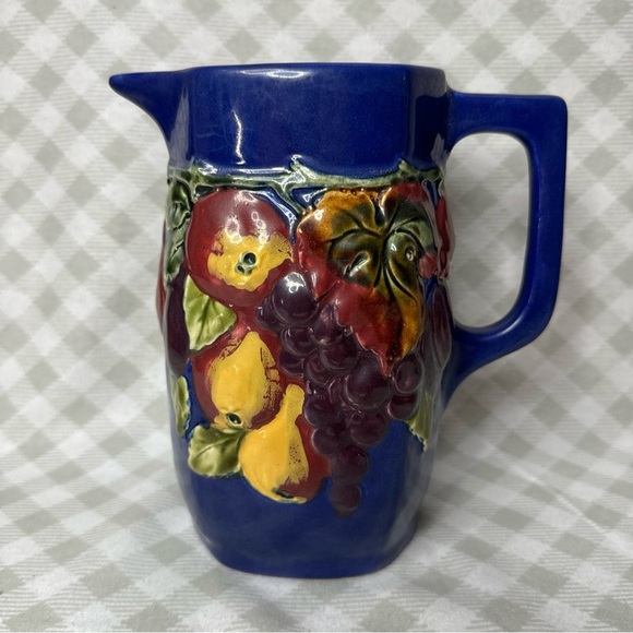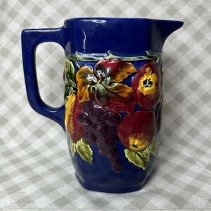 This antique pitcher from Czechoslovakia is a stunning piece of Bohemian Majolica artistry. The hand-painted design features a colorful abstract shape with a glossy finish. The pitcher has a capacity of 1.5 liters and comes with a handle for easy pouring.