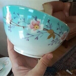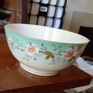 antique cherry blossom bowl with gold trim. small chip. from d&c france. porcelain china bowl cherry blossoms