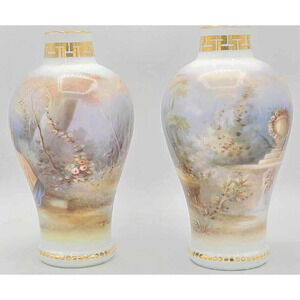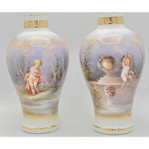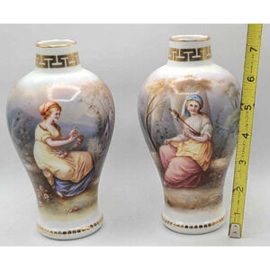 Antique Dresden Hand-Painted Pair of 7 1/4"H Vases. Work of Art.