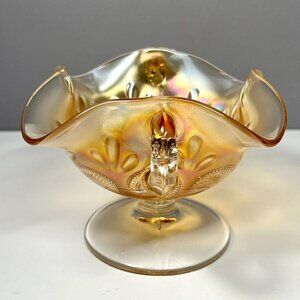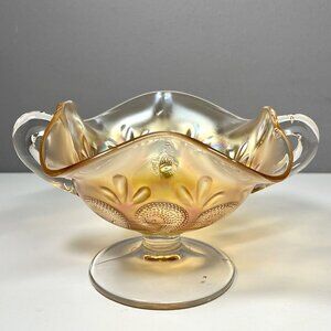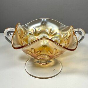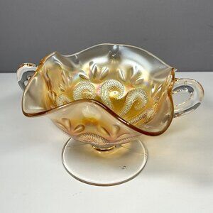 Antique Dugan Carnival Glass Question Marks Marigold Two Handled Footed Bon Bon