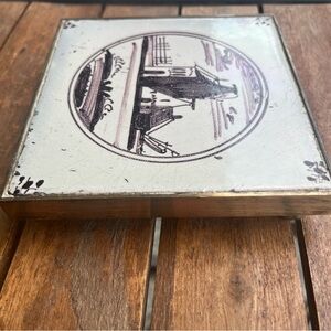 This Antique Dutch Delft Tile from the 18th century is a small square trivet featuring a picturesque landscape scene in magenta color. Made in the Netherlands, this original Delft tile trivet has a height and width of 5.25 inches, this collectible piece showcases traditional Dutch art and landscape themes, making it a unique and charming addition to any home decor.