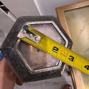 Repousse and engraved silver-plate teapot from E. G. Webster & Son has a row of amusing figures around the middle--dancing men, a woman with a child, a man reading, etc. The remainder of the surface is covered with intricately engraved scrolls and flowers. The mark on the bottom, which is a sort of "pseudo" hallmark very similar to British silver marks, is from E G Webster & Son and dates the piece from 1886 to 1928.