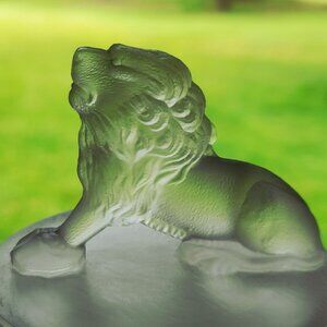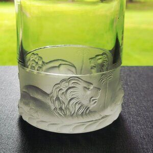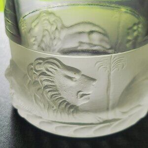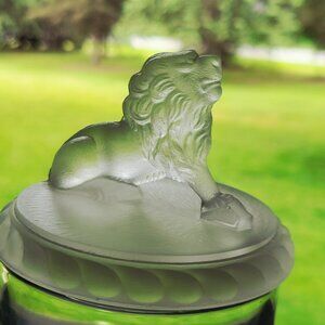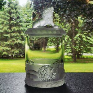 This Gillinder & Sons frosted glass jar features a majestic lion motif and intricate etched details. Its antique charm makes a timeless addition to any décor.
