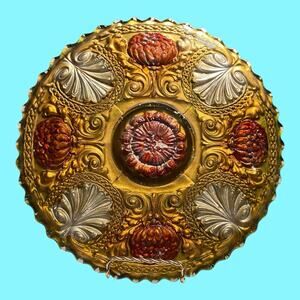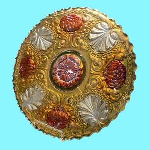 Antique EAPG Goofus Glass 11" Plate Gold Red Flowers Silver Acanthus Leaves