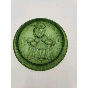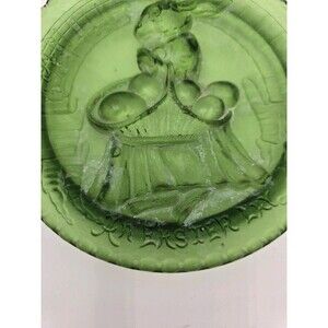 Antique Green glass plate "An Easter Lay" measures approximately 6" in diameter. No chips or cracks. Has a white residue, perhaps from previous cleaning, and some other spots of color. Please see pictures for best idea of condition.