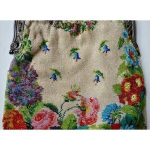Antique Edwardian Glass Bead Flower Roses Purse Silver Cherub Frame Czech?