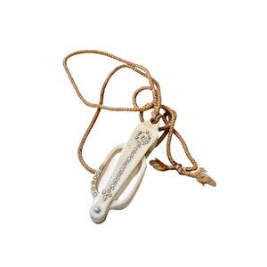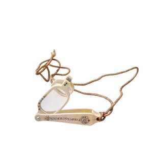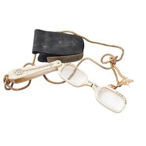 This elegant pair of antique Edwardian-era lorgnette glasses features a delicate folding mechanism with a rhinestone-studded handle. Crafted from faux ivory material with a built-in loop for chain or ribbon attachment, these vintage spectacles come with the original protective case. Ideal for collectors or as a unique accessory for period costumes and historical reenactments.