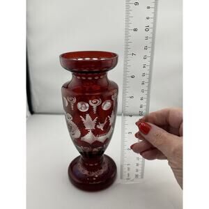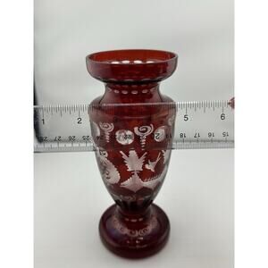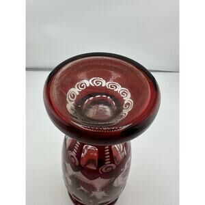 This Antique Egermann Ruby Red cut to Clear Crystal Vase from the 1920s Czech Republic is a stunning example of Bohemian glassmaking. Standing at 7 inches tall with a glossy finish and intricate etched details, this vase exudes a decorative and wildlife-themed charm. Handmade with a vibrant red color and featuring a cut glass production style, this original piece by Egermann is a true vintage beauty that would make a stunning addition to any collection or decor. The design is of birds, churches and abstract design. It is 7" tall and 3" wide. It weighs 10.4 ounces. It is in very good, antique condition with no chips. There are some small scratches on the base.