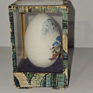 This vintage egg is a unique addition to any collection. It features intricate hand-painted details on a glass surface, accompanied by a wooden display case. The egg is 3.5 inches in height and length, and weighs 5 oz. The brand is Wooden and the type is Miniature, with a subject of an egg. This item is perfect for collectors of decorative collectibles, sculptures, and figurines.