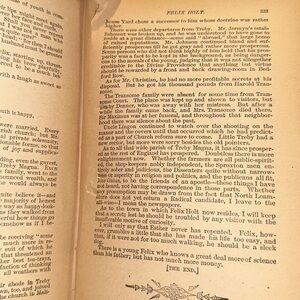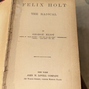 Antique copy of “Felix Holt, the Radical” by George Eliot, published by Lovell. This beautifully bound edition features an ornate embossed cover and spine, making it a lovely addition to any vintage book collection or home library.    •   Author: George Eliot (Mary Ann Evans)    •   Publisher: John W. Lovell Company    •   Publication date: Late 1800s (exact date not specified)    •   Binding: Decorative embossed hardcover    •   Condition: Good vintage condition with some wear to the spine and edges loose pages. (see photos).    •   Dimensions: 8.25” H x 5.25” W A wonderful gift for collectors of classic literature or antique decor. The John W. Lovell Company published “Felix Holt, The Radical” as part of their popular reprint series in the late 19th century, typically between 1880 and 1890.