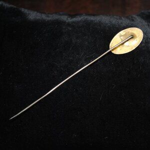This is an antique stick pin with an oval top that has the letter "A" engraved on it. The metal appears to be brass. There are normal signs of age and wear, but overall, the pin is in very great shape.