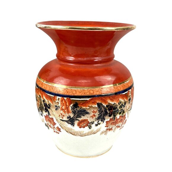 Antique Etruria Pottery Vase Floral Pattern Red Ivory Gold Trim 7.5" Wide" Decor