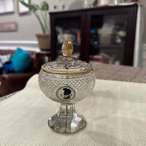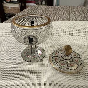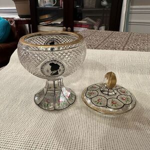 Antique European Cut Glass Covered Candy Nut Compote Handpainted RARE