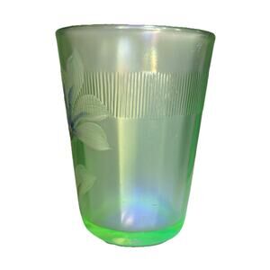 Antique Fenton Carnival Green Vaseline Glass Painted Daisy Flower Tumbler Cup 4”