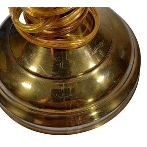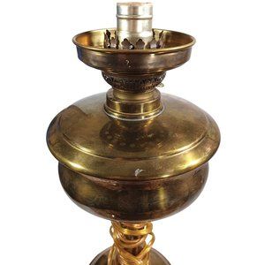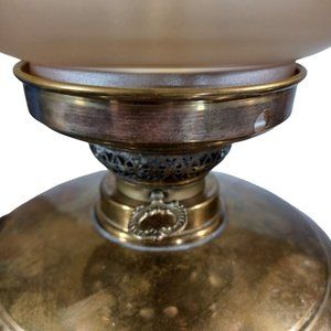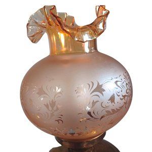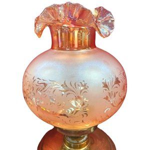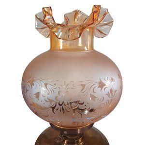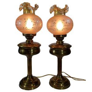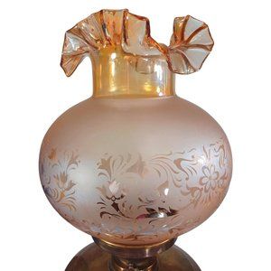 Antique Hurricane Oil Lamps Converted Electric Iridescent Etched Fenton Amber Shades Circa Early 20th Century, I am told the shades are original to the lamp but have no way to know for certain. A pair of beautiful antique hurricane lamps has been converted to electric lamps. The original keys are included but of course are just ornamental now. The shades are amber irridescent Fenton Ruffled blown glass with floral etching. The shades are not signed, Includes the 2 lightbulbs shown. Measurements 25" Tall 9.5" Wide Height without shade 16" not including bulb Width without shade 7.5" Weight 5 lbs 5 oz each Features: • Antique/Vintgae Size: 25" Condition: Pre-Owned Good