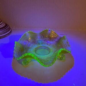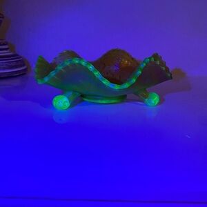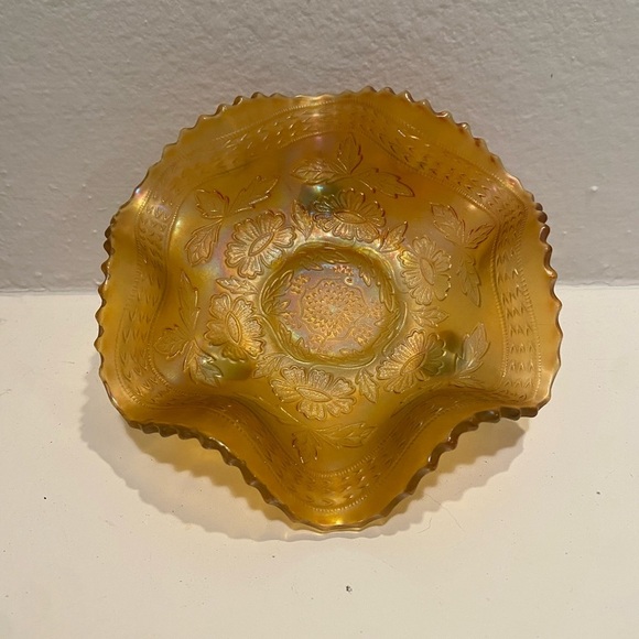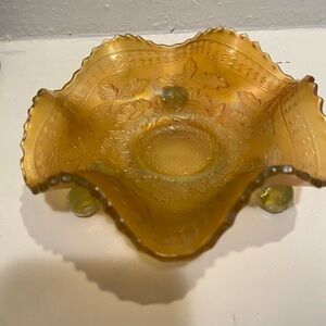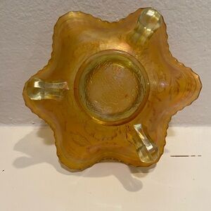 Perfect condition. Beautiful antique Fenton carnival glass 3 footed bowl. Gorgeous yellow orange color and marigold and Holly pattern.