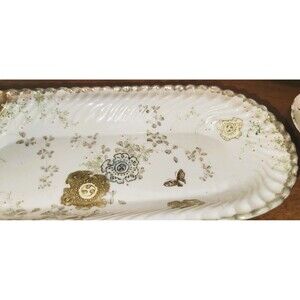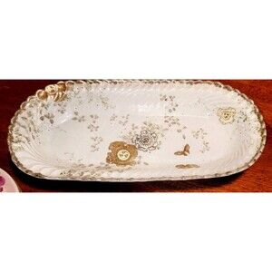 ANTIQUE FINE BONE CHINA SERVING DISH, Hand painted design of tiny leaves and large flowers, butterflies with much real gold guilt pained on the fine porcelain, and textured relief in the design. The antique porcelain Japanese dish has lovely scalloped sides with gold along the edging. Item originally purchased in England in 1950s, estimated production is late 19th century.