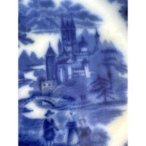 Has crazing on back and a small flat chip on edge with a few white spots that appear to have glaze loss. Front of plate in good condition, but shows a few faint brownish marks on left side of castle scene and some white areas that appear to be under the glaze.