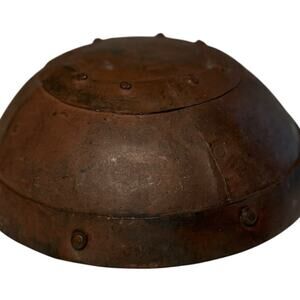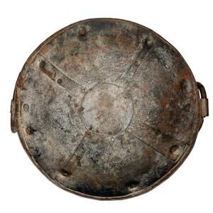 This antique forged iron bowl features hand-forged construction with two round ring handles and a beautifully aged patina. Its primitive, rustic form shows hammer marks, rivets, and natural wear consistent with early metalwork. Perfect for farmhouse, industrial, and historical décor, or displayed as an authentic antique collectible. Solid, heavy, and full of character.