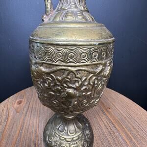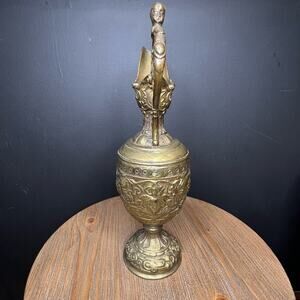 Antique French Cast Iron Pitcher Statue Jug Grape Vines Bacchus Amphora URN. Bronze in color. Approximate measurements: Height - 13 inches, Spout to Handle (Widest Point) - 6.5 inches, Base Width - 3.5 inches. Weight is just under 4 lbs. Decorative only - there is a hole in both the top and the bottom so it will not hold liquid without a plug or cork. This vintage item is pre-owned and dates to approximately 1900 -1940. It has a very heavy patina, but there are no obvious flaws or defects. Please view the photos carefully for features and condition of the item. You will receive the item shown in the photos. Fast Shipping! Most items ship within one business day. Thanks for looking!