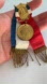 Antique French medal featuring a red, white, and blue ribbon with gold accents. Perfect for collectors or costumes.