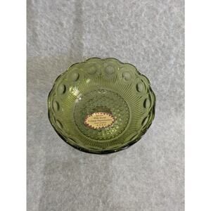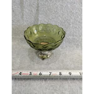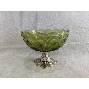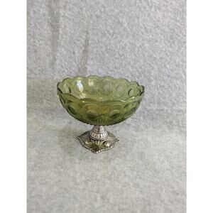 Antique Geniune Olde World Genevieve Pattern Glass Bowl Metal Pedestal Handcrafted USA Green