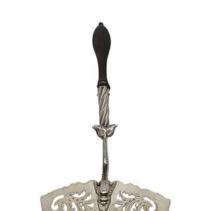 From the Georgian Era, this beautiful fish slice server features bright-cut design, including a lion on its rear legs on the back of the blade, on an ornate cut-out blade, and a koi fish on a twisted handle topped with wood.