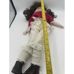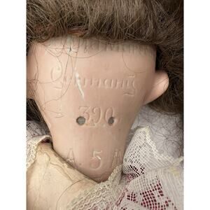 This Antique German Bisque 25” Armand Marseille 390 A 5 M Doll with Blue Eyes is a vintage collector's toy from the early 1900s. It features a porcelain construction with brown curly hair and a light complexion, representing a girl doll from the Armand Marseille brand. This original piece is part of the A5M series and is a single unit without packaging. The doll's ethnic background is Caucasian, and it appeals to collectors of dolls and vintage toys from the early 1900s.