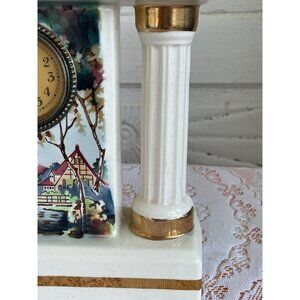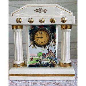 This non-working Antique German Mechanical Mantle Clock features hand-painted porcelain and pillar detailing. It's a unique piece that adds a touch of vintage elegance to any space. This measures 9.5" tall and 8.5" . The clock is not working so selling as a Non working clock. The front looks hand painted. The gold has some wear. A long the bae edge there is a small nick on the paint glaze. Overall displays well.