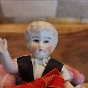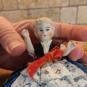 Antique German Porcelain Half Doll/ pin cushion doll with moving arms blue eyes