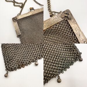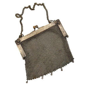 This antique German silver chain mail mesh evening bag is a stunning piece from W.J. Co. The intricate design features a dropped tassel and is perfect for a fancy occasion. The bag is made of mesh material and comes in a beautiful silver color. It is an antique accessory that could still be gently used and would add a touch of sophistication to the right outfit.