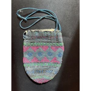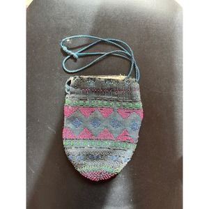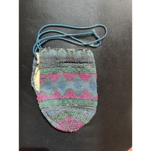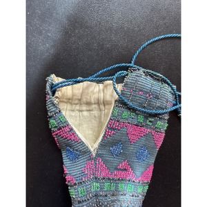 Glass beaded drawstring purse from around 1910 - 1920. Not entirely sure of the date. It is definitely antique and the beads are beautiful in pink, blue, green, black and clear. There are a few beads missing throughout the piece, which I've tried to capture in the photos. The lining is starting to separate from the bag a bit, but is still in place. Measures 7" long and 5" wide.