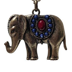 This elegant necklace features an antique gold elephant pendant, adorned with striking red and blue gemstone accents.