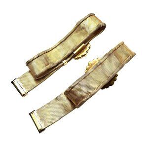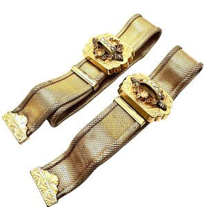 Elegant antique gold-filled wedding bracelets featuring intricate designs and adjustable sizing. Embellished with seed pearls for added charm, these ornate accessories are perfect for special occasions and timeless style.