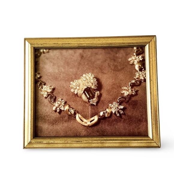 Beautiful professional art print of a jewelry set framed in antique gold colored wood frame complete with glass top. Free standing layout. Not for wall hanging.