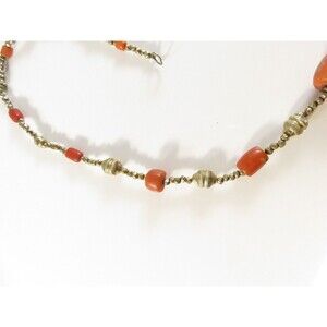 This is an antique necklace featuring natural coral beads, either coin silver or sterling silver faceted beads, and medium-sized oval silver ribbed beads. The necklace is crafted with gold vermeil over coin or sterling silver, showing losses to the gold vermeil. It has a simple hook closure and is a handmade piece. The necklace length is approximately 20 1/2". The coral beads need to be properly cleaned and polished. The ethnic origin is unknown but suspected to be a c1920 Yemen piece.