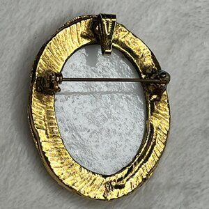 This antique brooch features a romantic hand-painted scene on porcelain, encased in a gold-plated frame. It adds vintage charm to any collection.