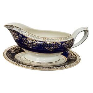 Antique Gravy Boat & Under Plate Crown Ducal Cobalt Blue Gold Floral England