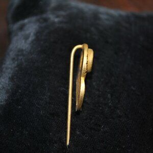 This is a unique antique stick pin with an Art Nouveau style top. The top is accented with a Greek key pattern, and it features a piece of red-pink cut glass. There is some loss of the golden color, especially around the edges. Overall, the pin is in very good shape.