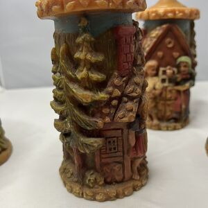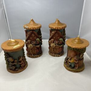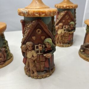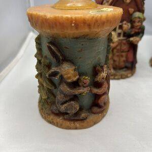 Large candle measures - 6.5 tall and feature a grandmother and grandchildren in front of a home with a lot of trees. Smaller candle measures - 4 tall, one features bunny and squirrel with stump mushrooms and trees other small candle features children with dog in front of home.