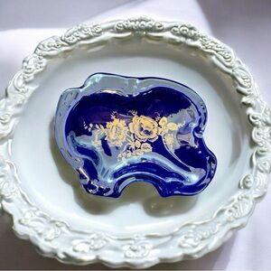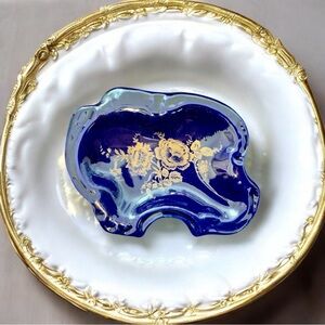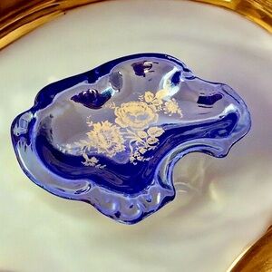 This is a stunning 100% cobalt porcelain dish marked "COBALT 100%" and the Polish maker's mark "HALAZIŃSKI POZNAŃ PLEWISKA." The piece features an irregular shape with a wavy, undulating rim and a hand-painted gold floral design. A very versatile and collectible piece. Made in Poland by Halaziński, located in Poznań-Plewiska.