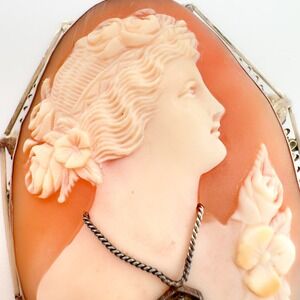 This lovely Victorian/Nouveau carved shell “habillé” or "dressed" cameo depicts a beautiful goddess, most likely Aphrodite with a diamond necklace. The Victorians were less concerned with mythological accuracy, instead requiring their cameos to follow the aesthetic of Romanticism. This charming example is large and skillfully executed, a true treasure.
