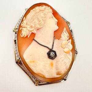 Antique Hand Carved Shell Cameo Habillé Brooch/Pendant 14k/10k Filigree Diamond