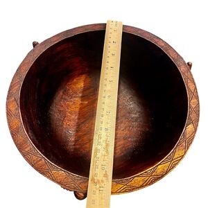 This bowl is in excellent antique condition. The measurements are provided in the photographs. It is 11 inches across and 5 inches high. The bowl is adorned with incising around the rim and the base and there are three lizards or geckos carved into the side of the bowl. It is made from a single piece of wood. This beautiful bowl has been attributed to Papua New Guinea. It came from a fine Sarasota Florida estate that had several important pieces from New Guinea, areas of Africa, and other global areas. I can only tell you what the attribution is. This is a beautiful heavy bowl. Solid wood.