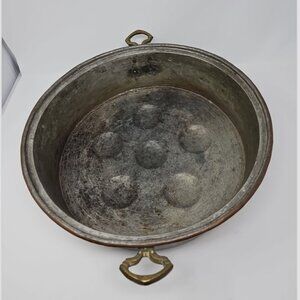 Up for offer here is an antique, later 18th to early 19th century, entirely hand hammered copper Abskelivar pan that is deep and extra large in size. There are 6 receptacle circles and these were traditionally used for cooking eggs, escargot and a type of pancake, throughout Europe, especially in France, Holland and Scandinavian countries. This is planished from a single piece of copper, there are no dovetail or cramp seams on the body. The rim is expertly bent at a fine even angle and then rolled outward. The craftsmanship of this is exceptional. At some time, later in the 19th century, the original handles, which were likely wrought iron, were replaced with cast molded brass handles; there is pentimento, or the evidence of where the original handles were. Interior is tinned. Measures approximately 16" wide or 19.25" including the brass handles x 5.5" deep. The receptacles measure 2.75" wide.